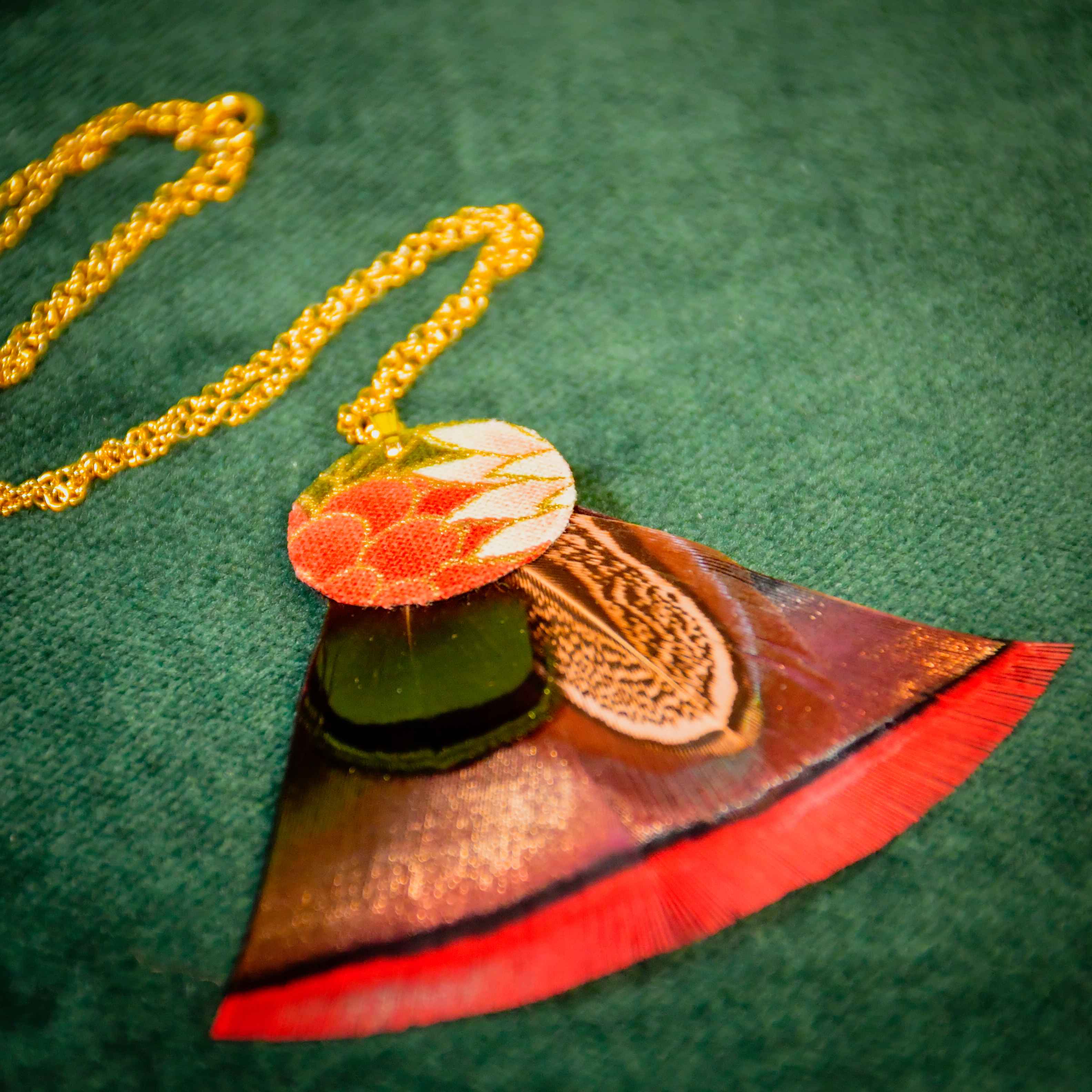 Plumetis vous propose ce collier aux influences japonaises. Il est constitué d'une plume de faisan Lady Amherst vert, d'une plume de faisan commun teintée, d'une plume de dindon bronze teintée, avec un morceau de tissu japonais en coton. La bélière et la chaine sont en gold filled. La chaine mesure 46 centimètres.
